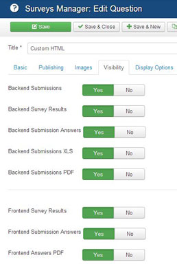 - Feature: new 'Visibility' question settings allows complete control over question display areas: 'Backend Submissions', 'Backend Survey Results', 'Backend Submission Answers', 'Backend Submissions XLS', 'Backend Submissions PDF', 'Frontend Survey Results', 'Frontend Submission Answers', 'Frontend Answers PDF'.